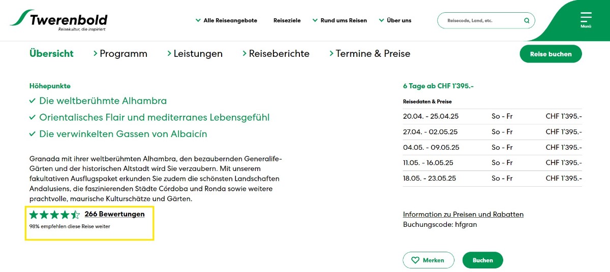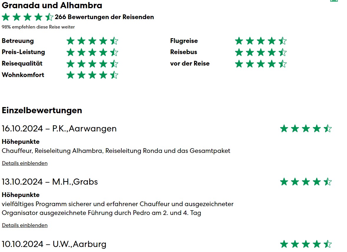 Auf unserer Webseite werden die Qualitätsrückmeldungen unserer Kunden bei den einzelnen Reisen angezeigt. So erfahren Sie aus erster Hand wie unsere Gäste die jeweilige Reise erlebt haben und was Sie in Ihren Ferien erwarten dürfen. Bei der jeweiligen Reiseausschreibung gelangen Sie mit einem Klick auf «Bewertungen» zur detaillierten Ansicht der einzelnen Kundenrückmeldungen.